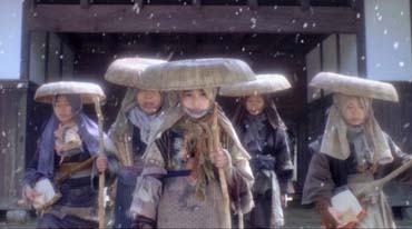 雪道をとぼとぼと連れ立って歩く瞽女の群れ。